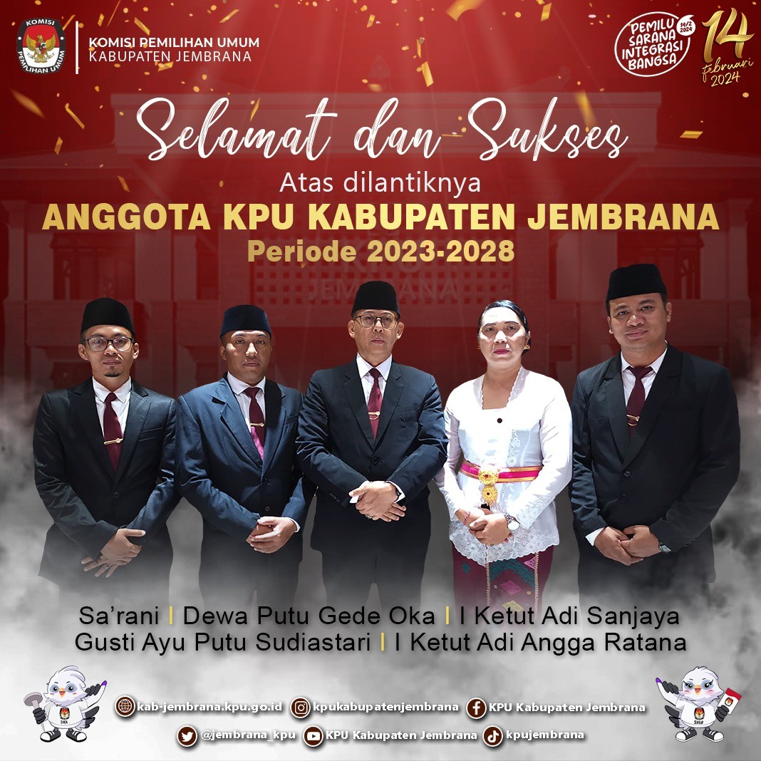Sesuai dengan Pengumuman Nomor 117/SDN.12-Pu/04/2023 Tentang Calon Anggota Komisi Pemilihan Umum Kabupaten/Kota di 9 (Sembilan) Provinsi Periode 2023 – 2028. Untuk KPU Kabupaten Jembrana, nama-nama yang terpilih adalah Dewa Putu Gede Oka, Gusti Ayu Putu Sudiastari, I Ketut Adi Angga Ratana, I Ketut Adi Sanjaya dan Sa’rani.