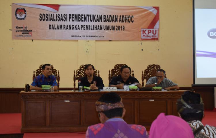 KPU Jembrana melaksanakan sosialisasi pembentukan Badan ADHOC Pemilihan Umum tahun 2019. Acara dimulai pikul 10.00 WITA diawali dengan menyanyikan lagu Kebangsaan Indonesia Raya dan Doa. Acara diikuti oleh undangan yaitu PPK/PPS beserta sekretaris Se-Kabupaten Jembrana. Acara dibuka oleh Ketua KPU Jembrana I Gusti Ngurah Agus Darmasanjaya didampingi oleh 3 Anggota Komisioner (Nengah Suardana, Made Widiastra, I Putu Eka Sutamarbawa). Dilanjutkan dengan pemaparan materi oleh divisi SDM dan Parmas Made Widiastra.
