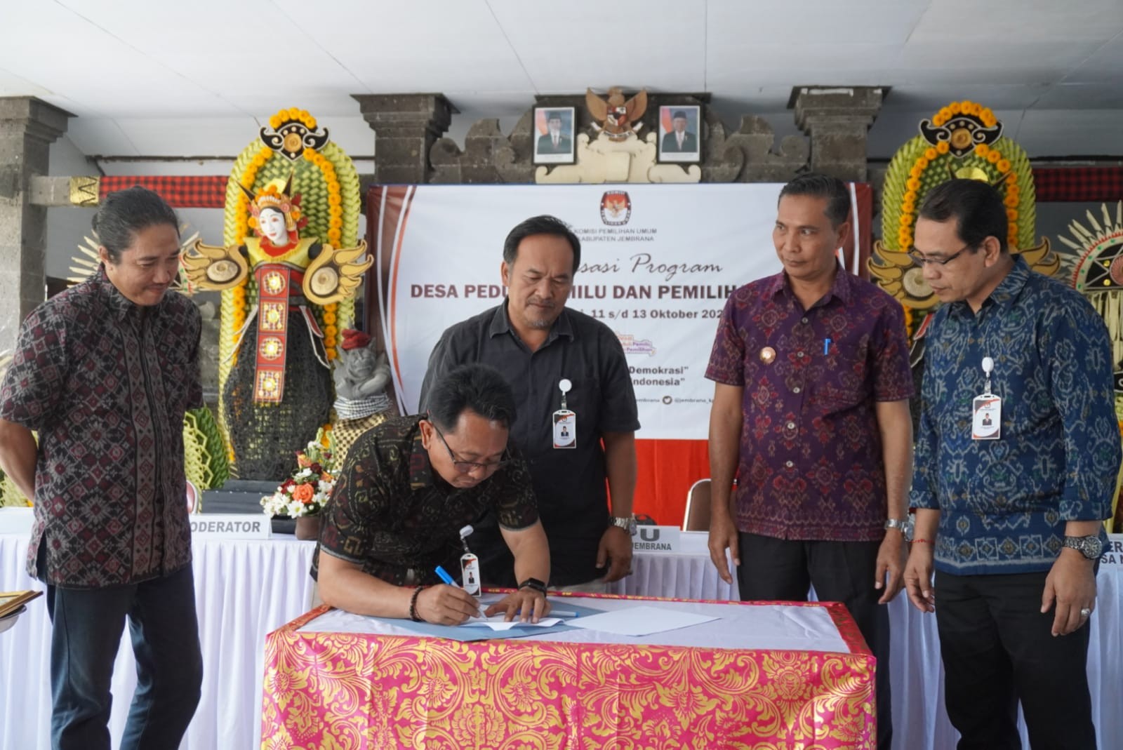 #TemanPemilih – Hari pertama KPU Kabupaten Jembrana melaksanakan Sosialisasi Program Desa Peduli Pemilu dan Pemilihan (DP3) di Desa Nusasari, Kecamatan Melaya. Sosialisasi hari pertama Selasa, 11 Oktober 2022 dibuka oleh Ketua KPU Kabupaten Jembrana I Ketut Gde Tangkas Sudiantara memberikan apresiasi kepada Perbekel Desa Nusasari yang sudah memfasilitasi KPU Kabupaten Jembrana dalam melaksanakan Program DP3 sekaligus memberikan Penghargaan kepada Perbekel Desa Nusasari I Wayan Ardana. Dalam acara tersebut juga dilaksanakan penandatangan Perjanjian Kerja Sama (PKS) dengan Perbekel Desa Nusasari.