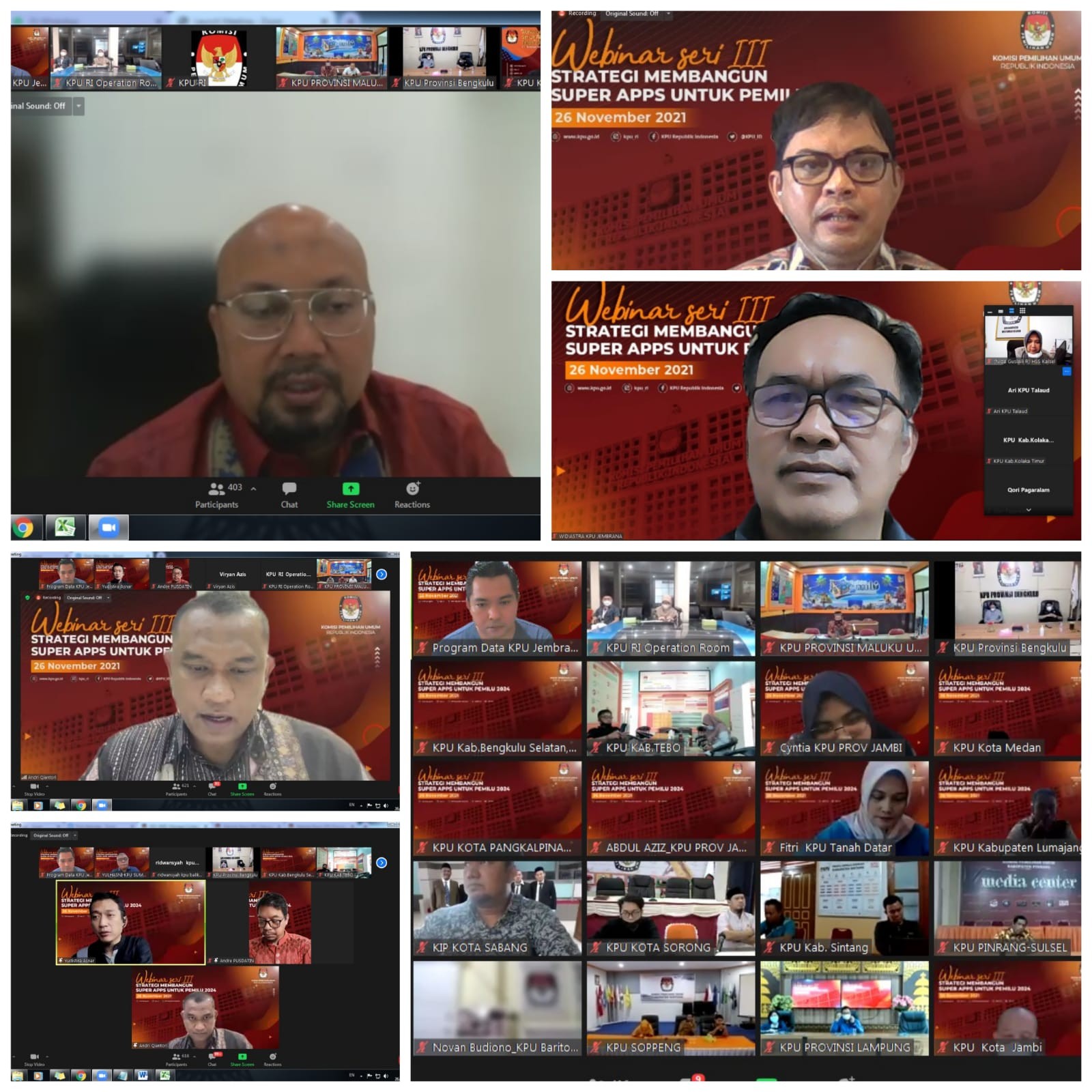 Acara yang dibuka oleh Ketua KPU RI, Ilham Saputra didampingi oleh Viryan selaku Pengantar Webinar yang menjelaskan tentang pentingnya penerapan aplikasi super (Super Apps) pada penyelenggaraan Pemilu serentak tahun 2024. Dalam materinya para narasumber juga menjelaskan bahwa dengan aplikasi ini diharapkan akan mempermudah dan dapat mengatasi problematika data dalam skala besar.